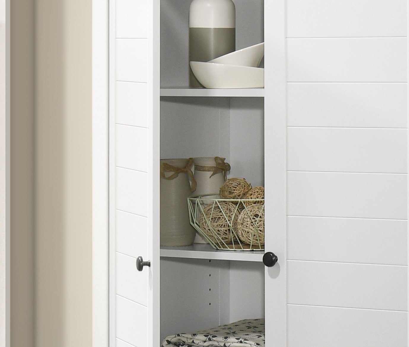The Claire Storage Cabinet is here to revolutionize your organization game! The framed panel doors with slatted design bring a touch of timeless sophistication to your surroundings. Whether you're aiming for a rustic farmhouse vibe or a classic aesthetic, this cabinet seamlessly complements your decor with its refined design. The cabinet comes in a refreshing white finish with oak accents, providing a crisp and clean look that brightens up any room. The top of the cabinet provides ample space for displaying cherished mementos or decorative accents. Plus, with four adjustable shelves, you have the freedom to customize the interior to accommodate items of various sizes, making it an ideal storage solution for books, knick-knacks, or even media components. With plenty of storage compartments behind the doors, the Claire Storage Cabinet provides the perfect space to keep your clutter out of sight and your space looking serene.