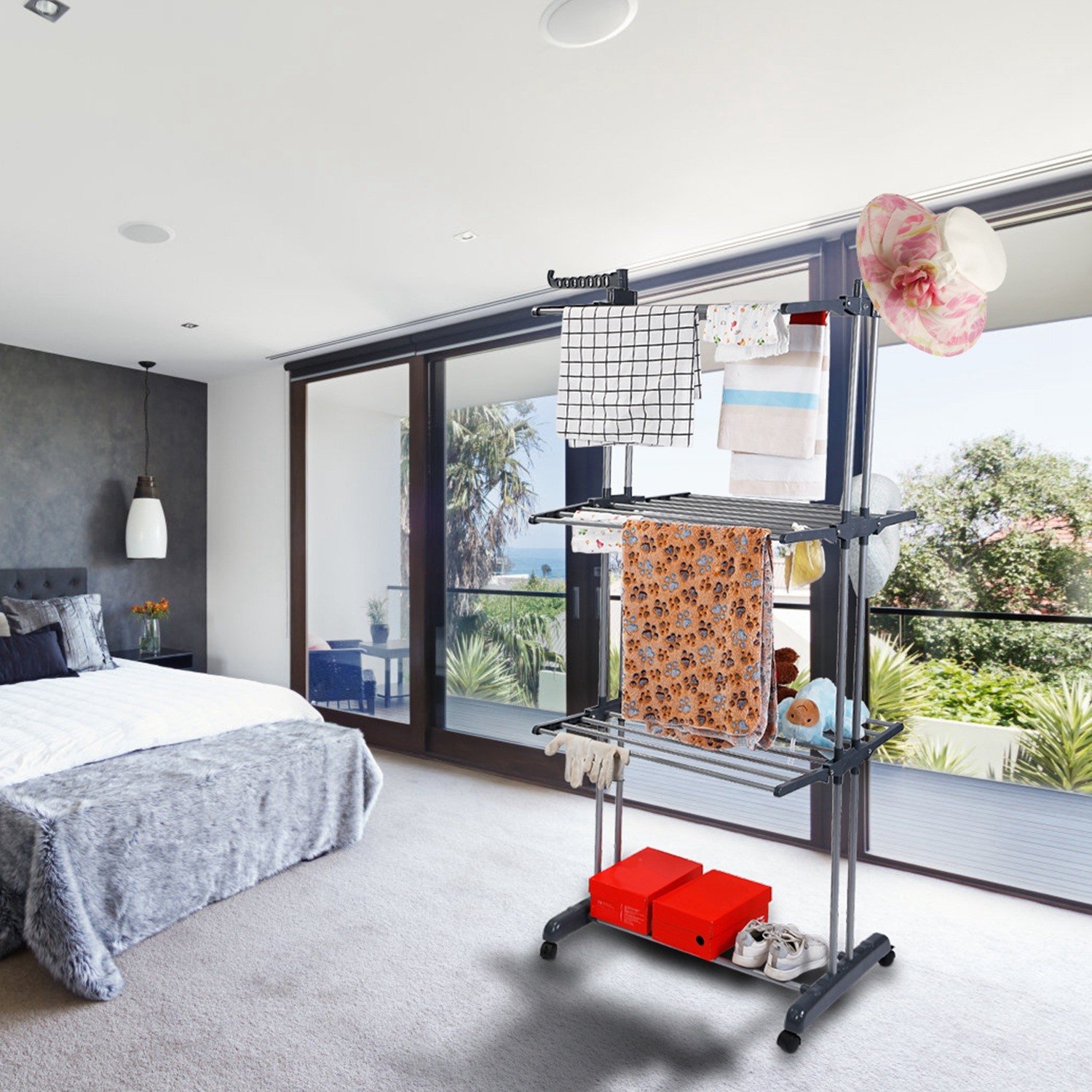 ** 3-Tier Clothes Rack*:With 3 tiers,bottom shoe rack and 2 side wings,you can hang your clothes with a nice amount of space between them so they can dry thoroughly.