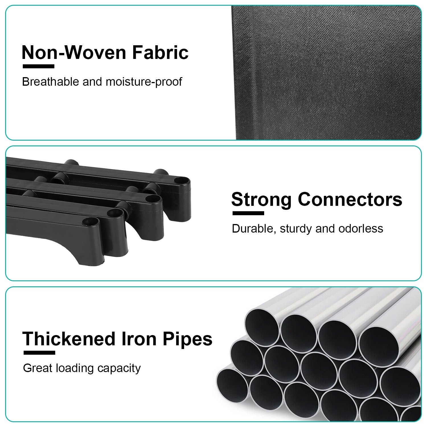 *Sturdy & Durable*:Made of thickened iron pipes,has great load bearing capacity and withstand heavy stuffs. Coated non-woven fabric is breathable,durable,and moisture-proof. Opening design ensure ventilation and easy to fetch items.