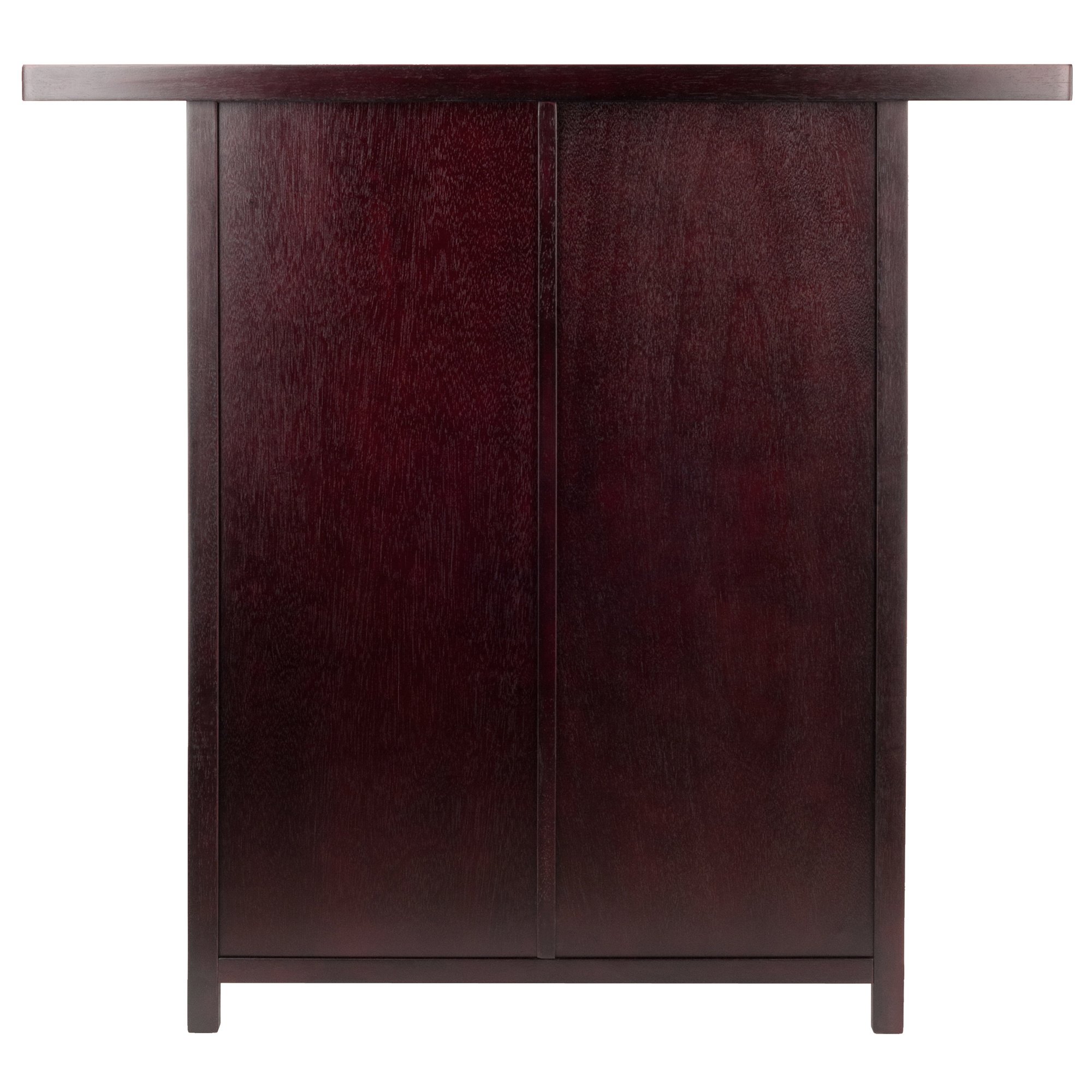 Clean lines; a sleek Espresso finish; and charming wainscoting side panels come together in the Macon Wine Bar. A natural for entertaining or just a relaxing evening at home; this versatile piece provides a wooden wine grid for up to a dozen wine bottles with room in the open shelves and cabinet for more. The wide bar tabletop is an ideal workspace for preparing drinks and serving appetizers. The uppermost open shelf has a built-in stemware holder to securely display your favorite glasses. An easy-glide drawer and lower cabinet provide plenty of room to keep bar accessories; plates; silverware and extra glassware at your fingertips. The drawer and cabinet door are finished with brushed nickel knobs. Made of Solid and Composite Wood in Espresso finish.