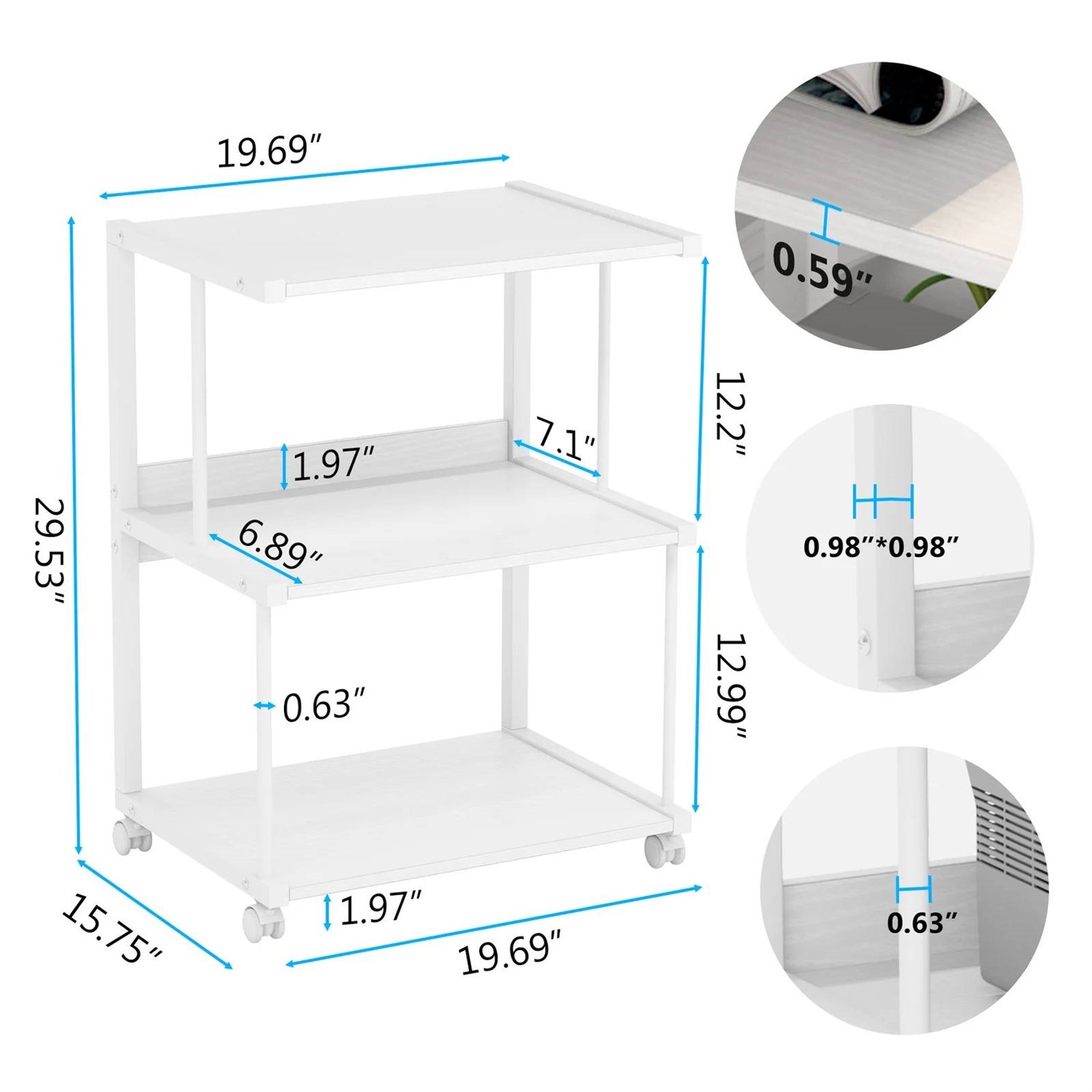 • AMPLE STORAGE SPACE: This compact printer table comes with 3-tier design, the 15.7 x 19.7 inch tabletop can hold most printer, scanner or fax machines, while 2 bottom open shelves can used to store files, books, printer suppliers, magazines and other office supplies. Max 70 lbs of weight capacity for shelf