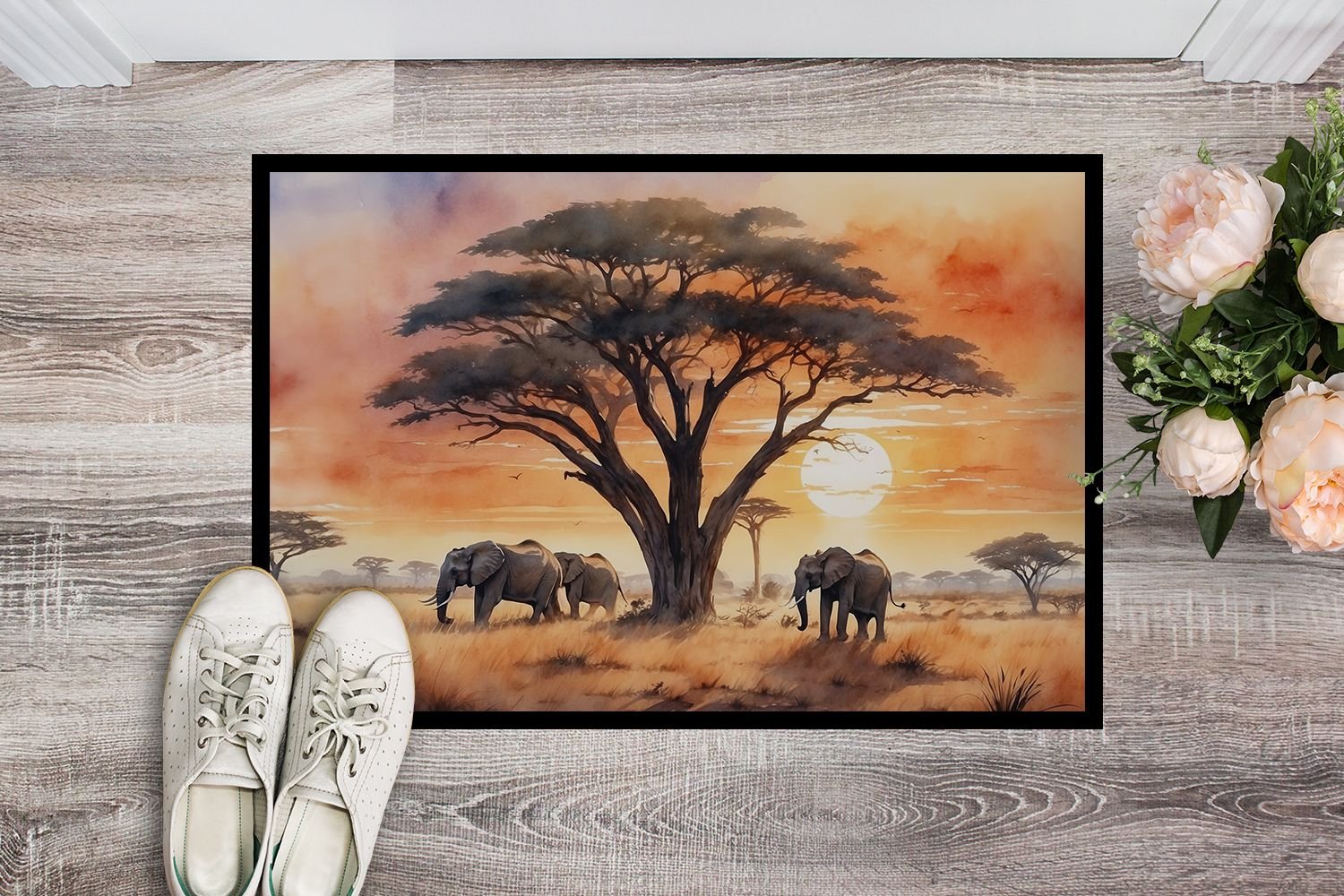 Home > Elephants Savanna Sunrise Doormat Front Door Mat Indoor Outdoor Rugs for Entryway, Non Slip Washable Low Pile, 24H X 36W