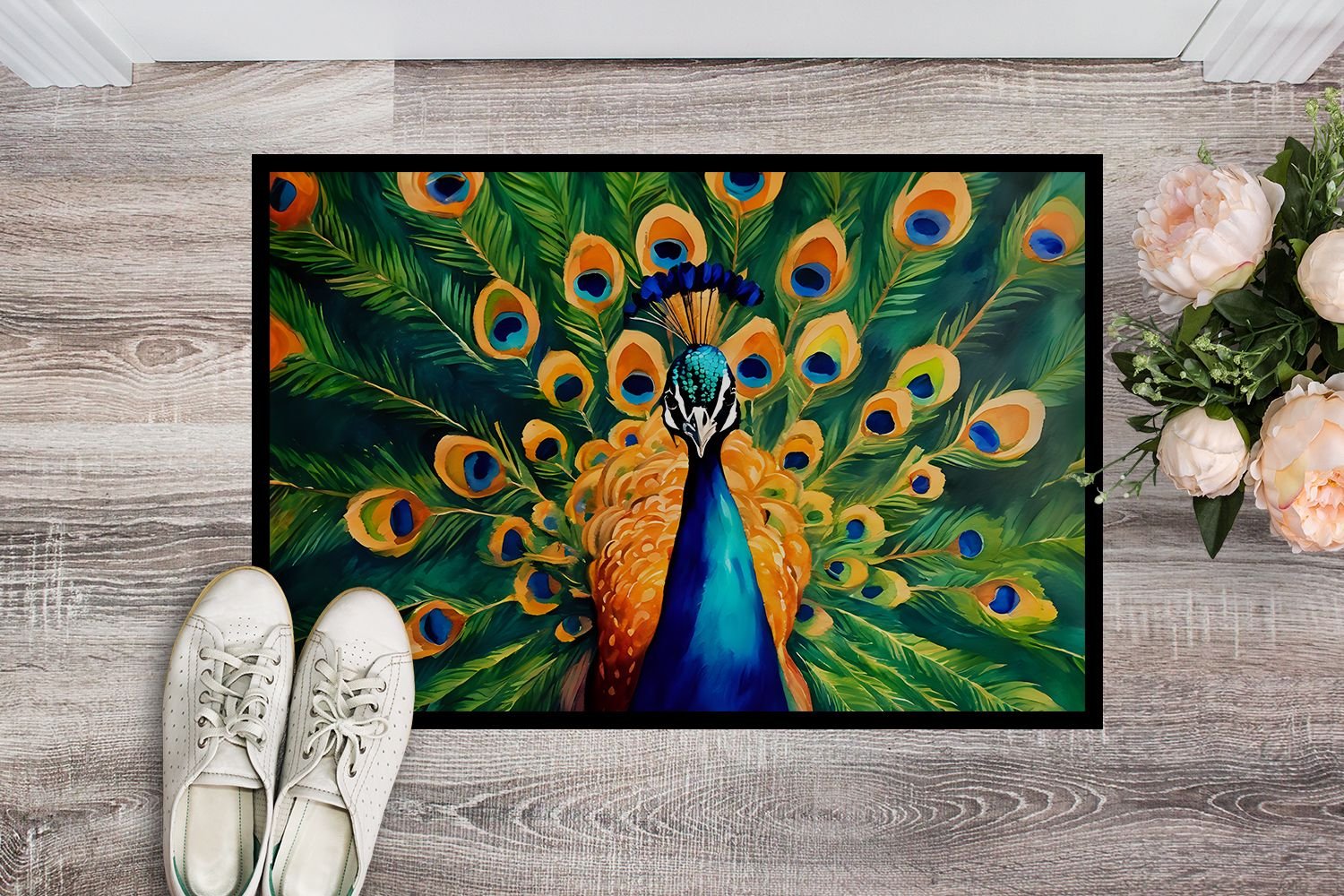 Doormat featuring breed specific Peacock artwork. Welcome your guests in style with our Artwork Door Mat, designed to withstand almost any weather condition. This mat, measuring approximately 18 by 27 inches, is held together by durable black binding tape. Its top layer, composed of polyester felt, is dyed with the eye-catching image you see on the mat. A few layers below provide the mat with stability, while its rubber bottom is stamped to help prevent slipping and ensures safety. Our mat works wonderfully as both an indoor or outdoor door mat. For cleaning, simply hose it off with water or use a power washer - no need for any cleaner that produces suds. Avoid scrubbing with a brush, instead, opt for the vacuum on floor setting. Designed manufactured and printed in the USA, this mat is a perfect addition to your porch, outdoor kitchen, entryway, or any indoor space. Its unique design makes it a charming decorative rug that greets your guests and adds a stylish touch to your home decor.