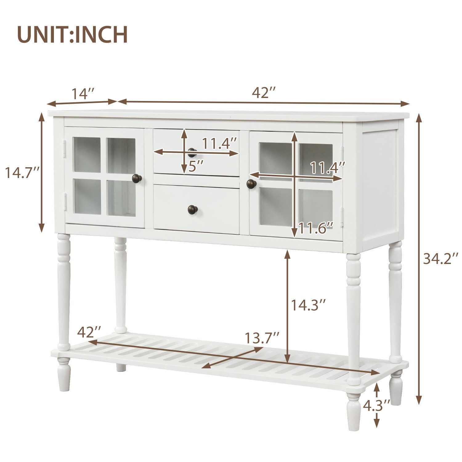 Featuring spacious open table top and bottom shelf, two glass-front cabinets and two drawers, this sideboard provide you enough storage space for your favorite decorations or books or for storing necessities and tableware.Exquisite appearance design, the sleek corners of the bottom plate and distinctive solid wood Roman legs create a distressed retro style.