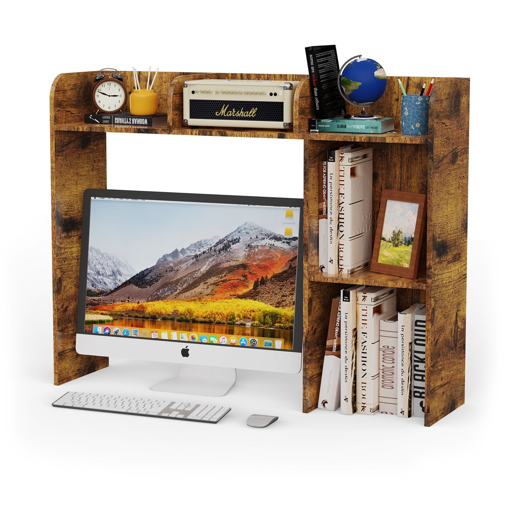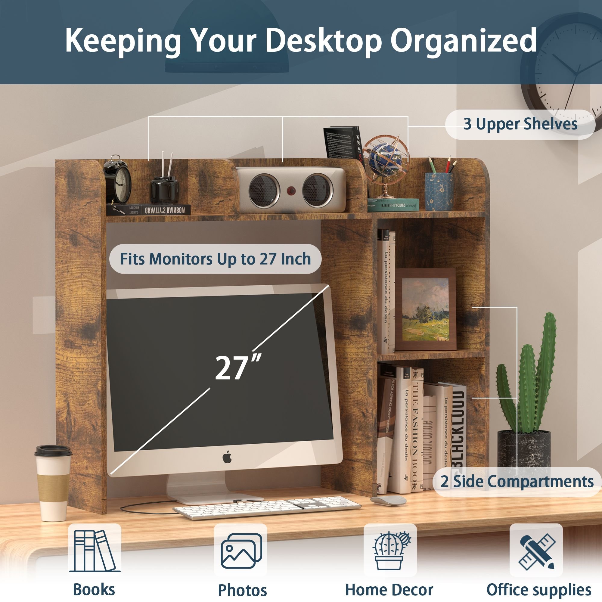 1. keeping your desktop organized :This desktop bookshelf is specifically built for computer desks, providing ample storage that can accommodate up to a 27-inch computer monitor, It features with 3 upper shelves and 2 large side compartments for easy categorization of your items.