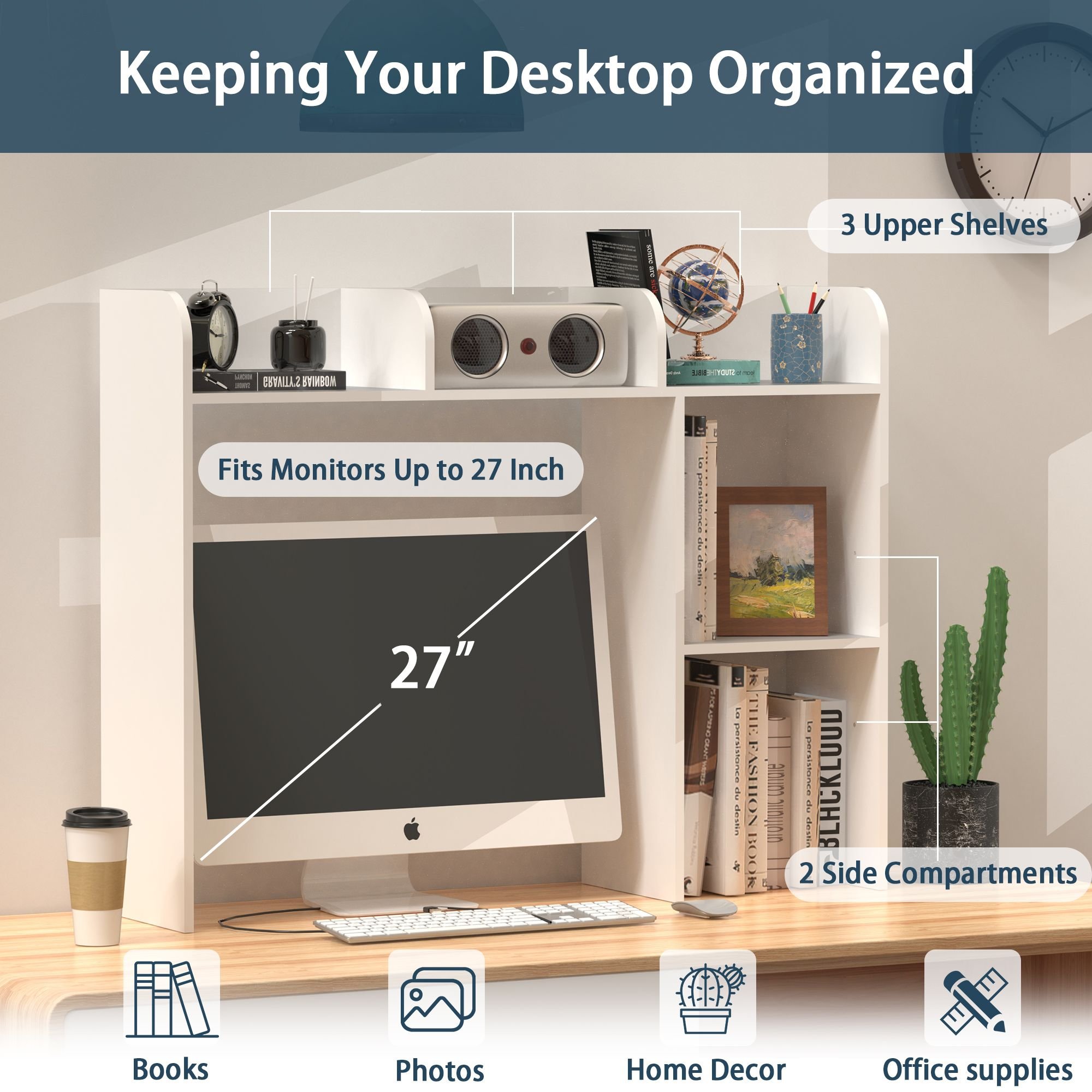 1. keeping your desktop organized :This desktop bookshelf is specifically built for computer desks, providing ample storage that can accommodate up to a 27-inch computer monitor, It features with 3 upper shelves and 2 large side compartments for easy categorization of your items.