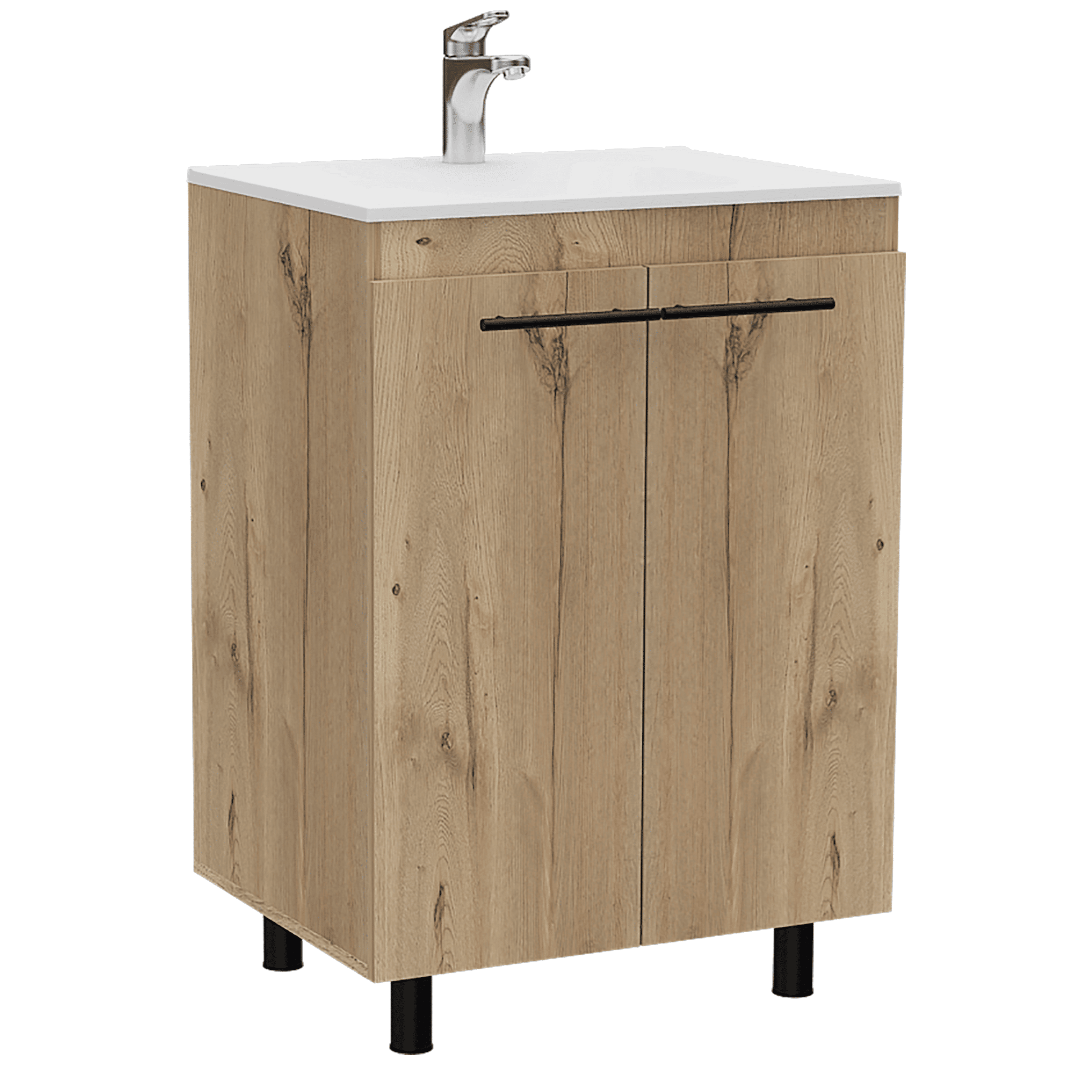 Dustin Freestanding Sink Cabinet is one of a kind. This model comes with a durable pure white reinforced resin superior top and features two doors, all metal hardware for a reliable and lasting product, adjustable legs for a better fitting of your space, and a hole sink. the cabinet with a depth of 18.1 Inches and standing at 34.1 Inches high will allow you plenty of space to connect the pipes and have plenty of storage space. This product is the perfect solution for narrow space bathrooms where the 23.8 In width comes as a key feature, by giving you an amazing top design product and still providing you with plenty of room in your bathroom. **FAUCET NOT INCLUDED** Designed with elegant light oak and white manufactured wood finish.
