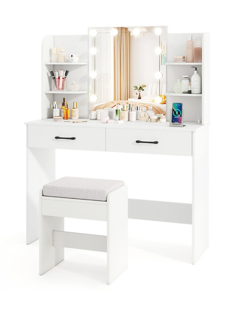 Vanity Set with Lighted Mirror and Stool with Power Outlet